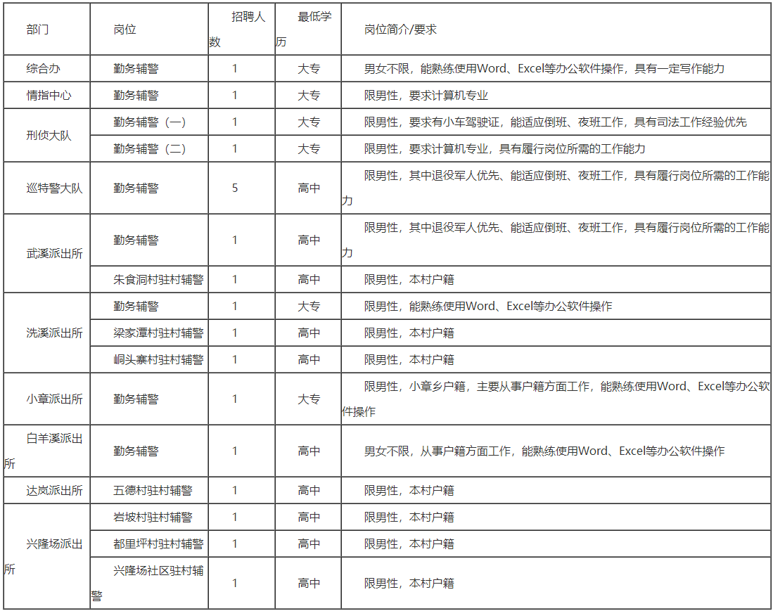 根据《湖南省警务辅助人员条例》有关规定,报县人力资源和社会保障局备案。县公安局决定面向社会公开招聘警务辅助人员13名,驻村警务辅助人员7名,协助人民警察开展相应的警务辅助工作,现将有关事项公告如下。