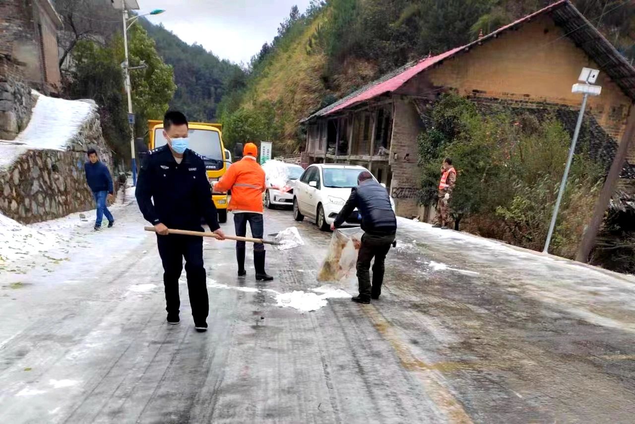11月30日开始,新邵县气温骤降,辖区部分地区一夜间银装素裹,冰雪封路。为确保人民群众出行安全,“公安蓝”如约而至,他们铲雪、除冰、清除路障,在群众最需要的时刻,守护群众平安出行。