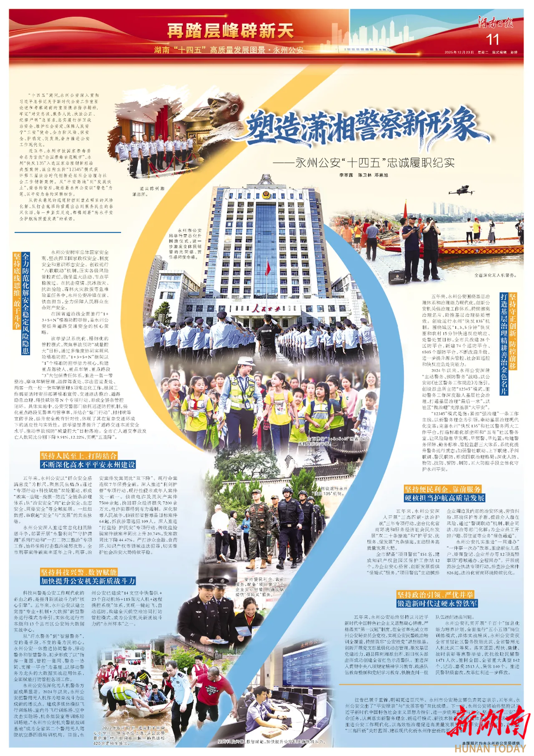 近五年,永州市被国家禁毒委命名为首批“全国禁毒示范城市”,永州“快反135”入选国家治理创新经验典型案例,派出所主防“12345”模式获评第三届法治时代创新论坛社会治理与社会工作创新案例。从“平安高地”到“发展沃土”,荣誉的背后,凝结着永州公安以“警色”为笔、以平安为卷的深耕细作。