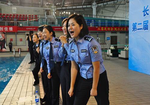 女特警在市局游泳比赛中,为特警选手呐喊加油