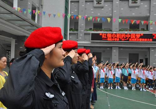 女特警与小学生共同庆祝六一儿童节暨升旗仪式,向国旗庄严敬礼