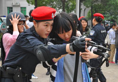 女特警在“警营开放日”活动中,教导女孩79式微型冲锋枪的使用方法