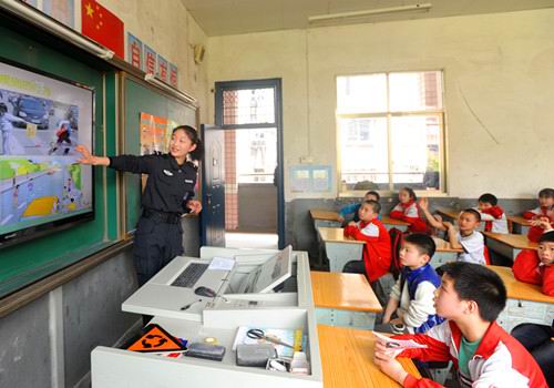 女特警在“校园安全宣讲”活动中,向小学生讲授交通安全知识