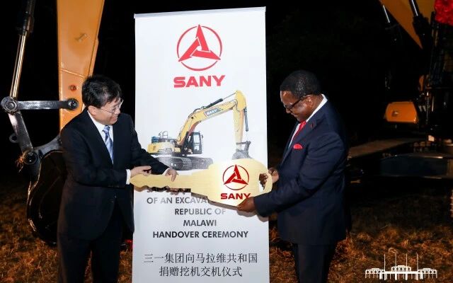 (9月11日下午,马拉维总统府,副省长、省公安厅厅长王一鸥向查克维拉总统交付三一集团捐赠的挖掘机。通讯员摄)