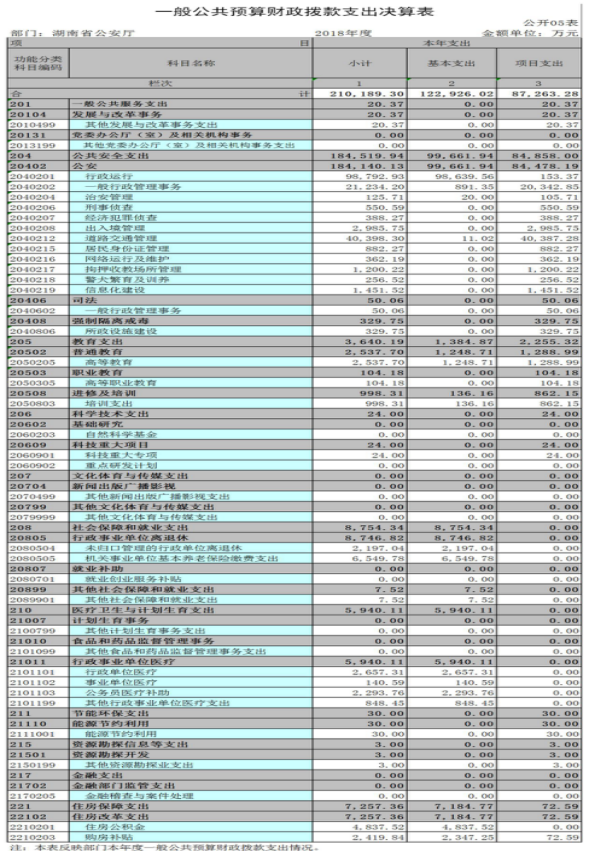 (三)财政拨款支出决算具体情况。2018年全厅财政拨款支出决算数210189.3万元,较年初预算增加了34875.77万元,主要原因为中央补助办案经费、湖南警察学院教育专户支出多为业务需要而年中下达,以及人员工资福利支出和社保缴费等年中存在变动。