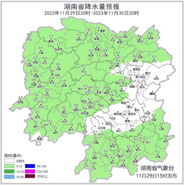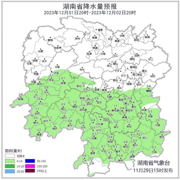 据省气象台预测,29日晚至12月1日白天受强冷空气和短波槽共同影响,全省有一次寒潮、大风、小雨天气过程。1日晚至2日受短波槽影响,省内云系较多,湘中、湘南部分地区有残留降水。