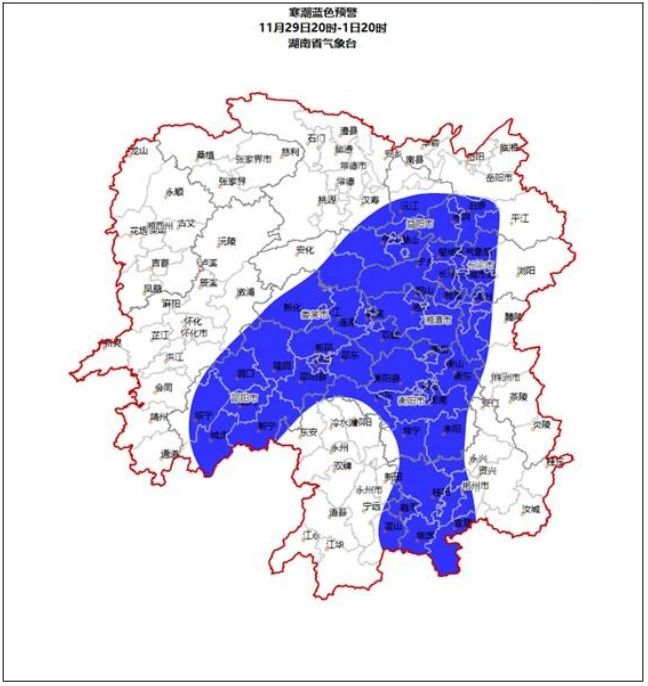 湖南省气象台11月29日16时发布寒潮蓝色预警,预计29日20时至1日20时,长沙、株洲西北部、湘潭、衡阳、邵阳、岳阳西南部、益阳东部、郴州西部、娄底最低气温将下降8~10℃,局地12℃以上,最低气温在4~8℃,并可能伴有5级以上偏北大风,请注意防范。