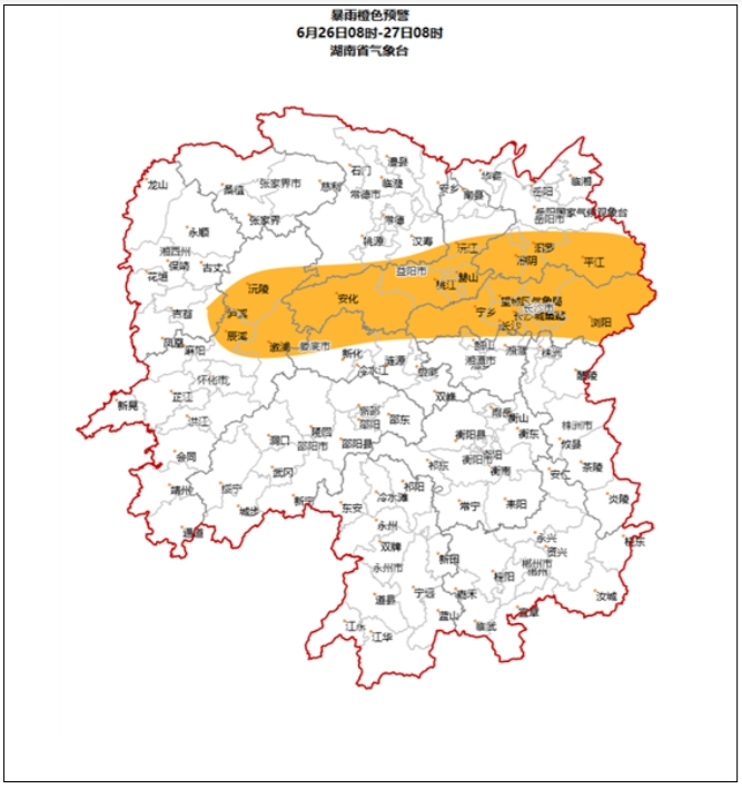 湖南省气象台6月26日6时发布暴雨橙色预警:预计26日8时至27日8时,长沙、岳阳南部、益阳南部、怀化北部部分地区将出现暴雨,局地大暴雨,并伴有短时强降水、雷雨大风等强对流天气。